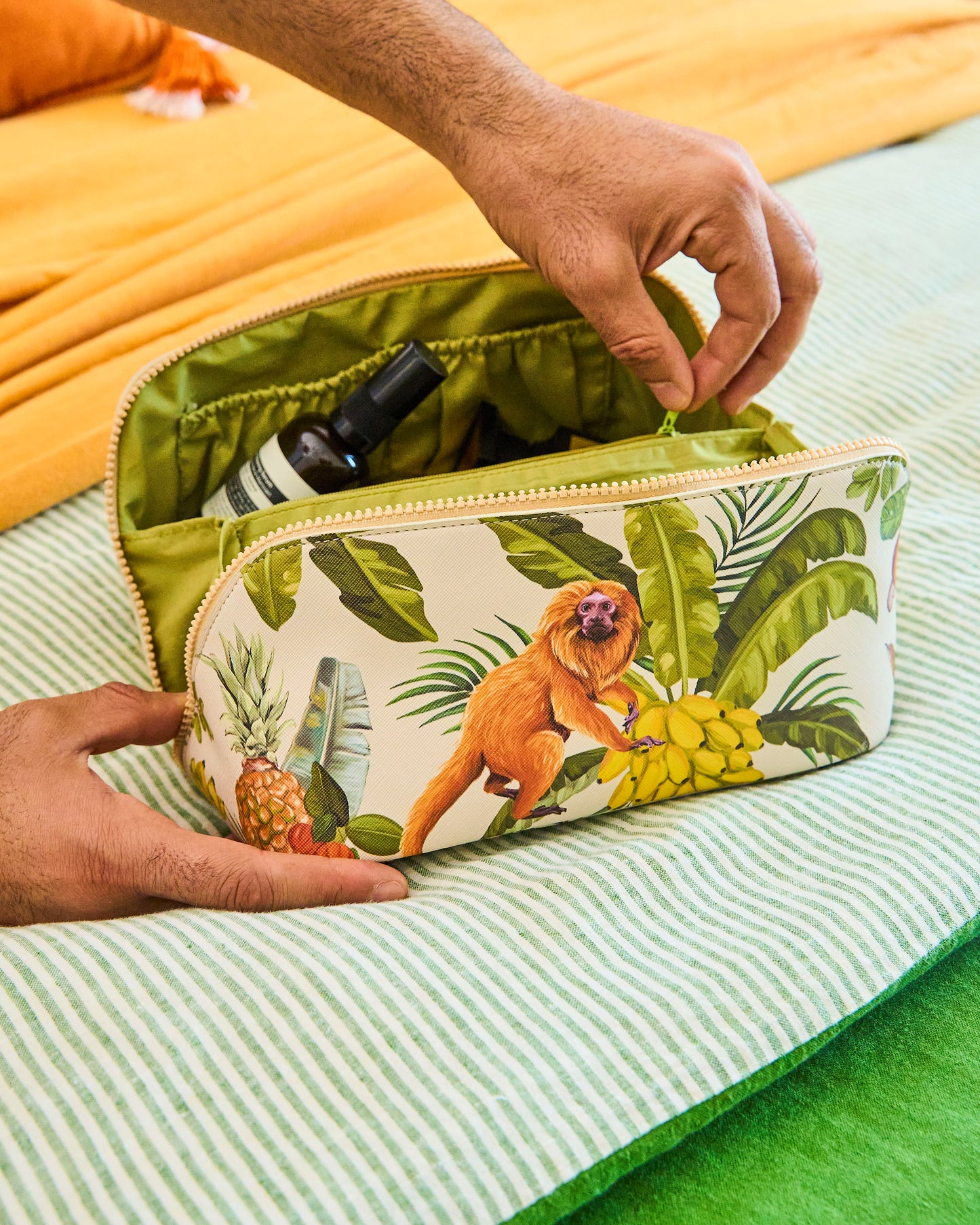 Printed on water-resistant vegan leather, our cosmetic bag is your perfect travel companion for packing skincare and makeup on your next trip away. The structured silhouette opens wide for easy access, while the spacious interior includes multiple compartments to keep your beauty essentials organised and secure. A sturdy zip closure and convenient top handle make it ideal for both travel and daily use.